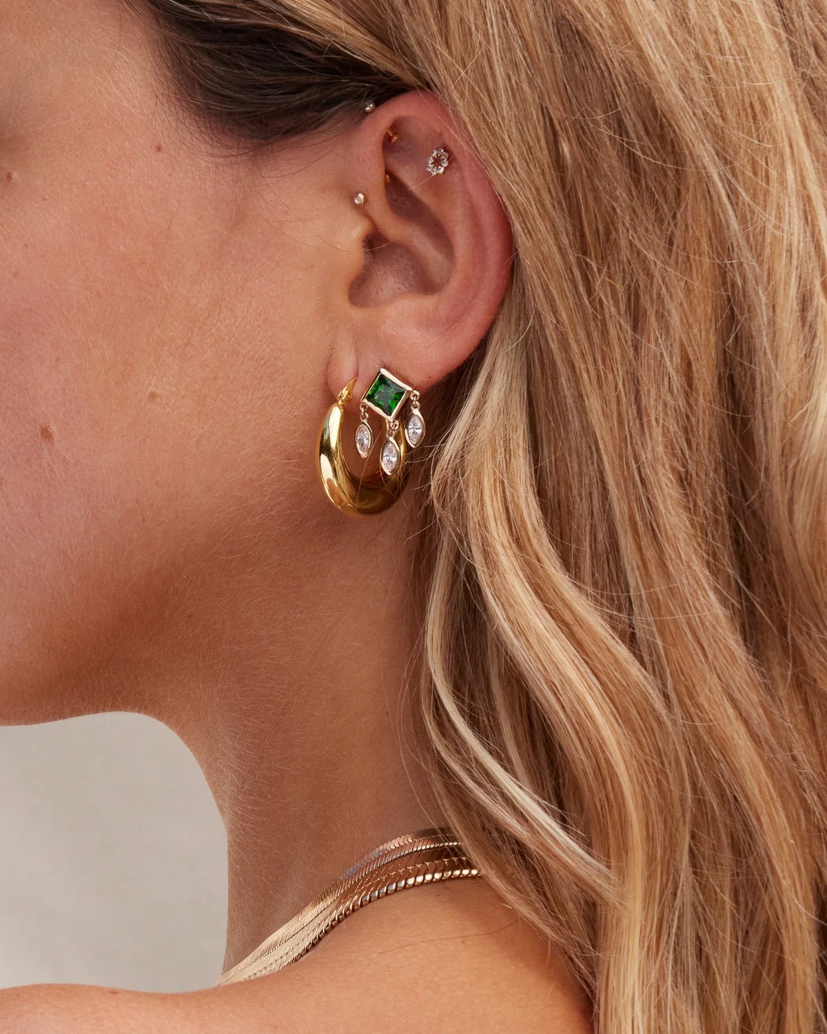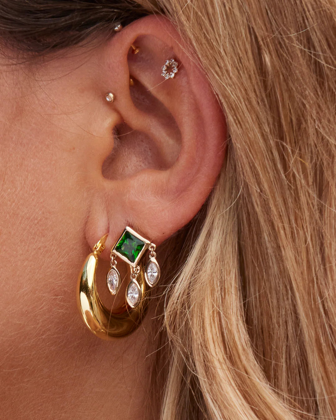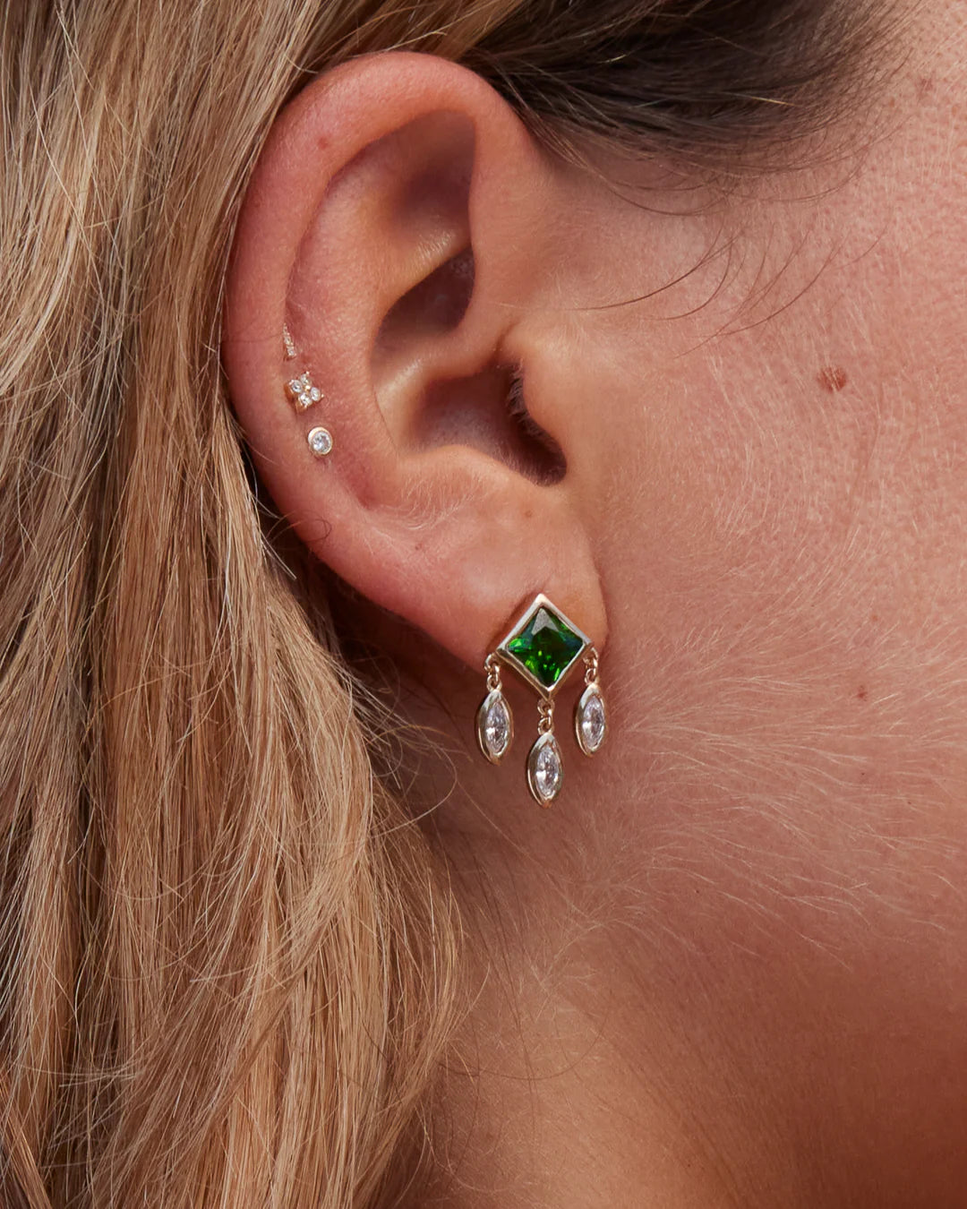 Ajoutez une touche d'élégance céleste à votre look avec les boucles d'oreilles HEAVEN. Un zircon vert émeraude taille princesse est associé à trois zircons blancs taille marquise, créant un bijou raffiné et lumineux. Leur design unique et leur mouvement délicat apporteront une touche de sophistication à toutes vos tenues.
