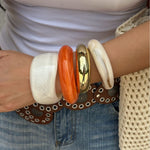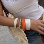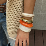 Les bracelets en résine apportent couleur, légèreté et éclat, tandis que l’acier inaltérable confère une touche durable et sophistiquée. Portés ensemble, ils créent un effet harmonieux et affirmé, parfait pour compléter vos tenues quotidiennes ou sublimer vos looks les plus élégants.