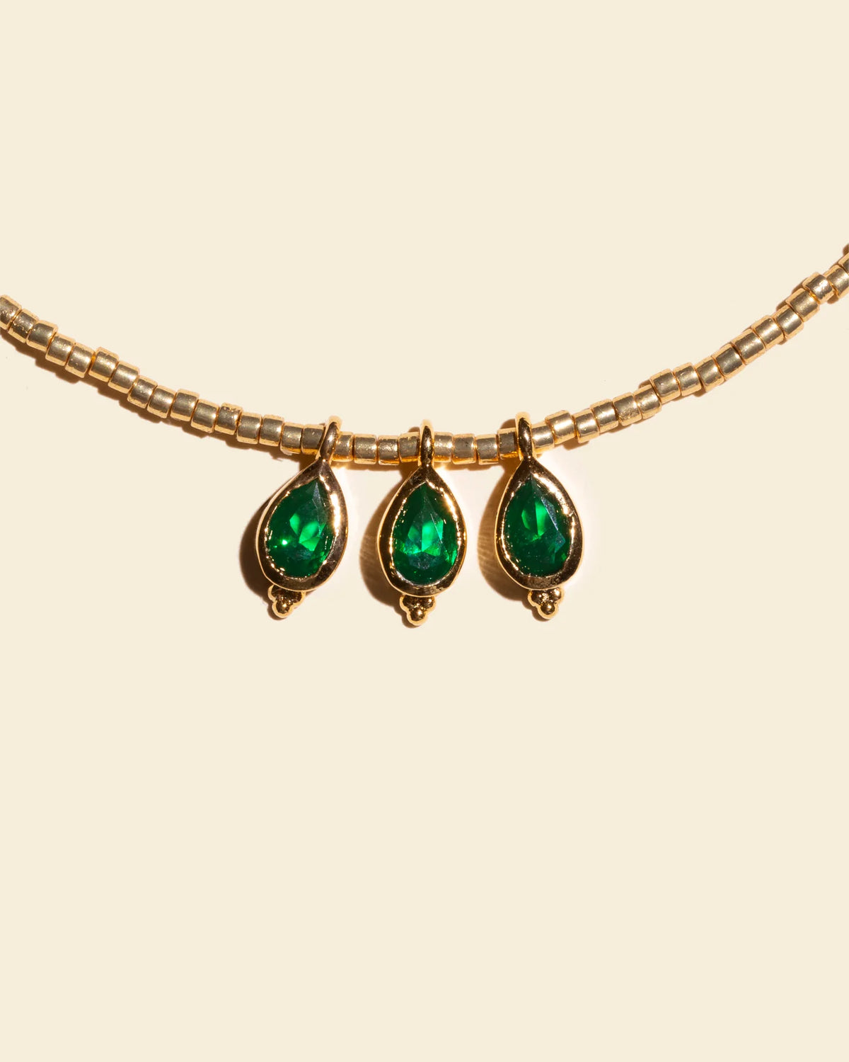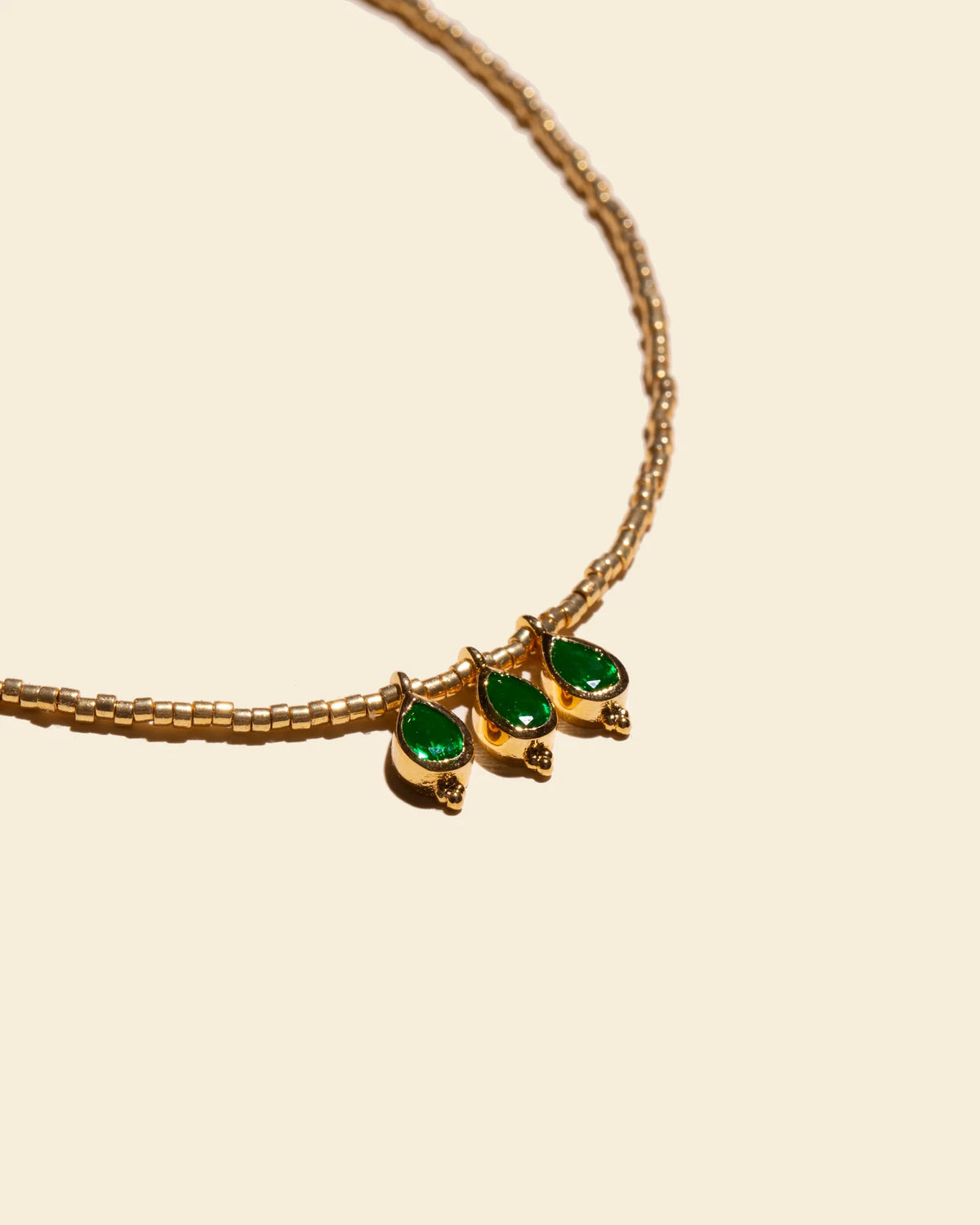 Tel un talisman, le collier ras-du-cou IRIS vous illumine d'une énergie solaire et féminine. De fines perles dorées enveloppent délicatement votre peau et subliment un trio de gouttes dorées serties de tourmaline verte lumineuse. Portez IRIS seul pour un look minimaliste ou en accumulation pour affirmer votre style et votre personnalité.