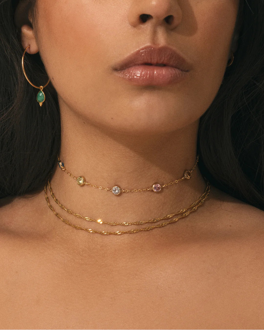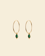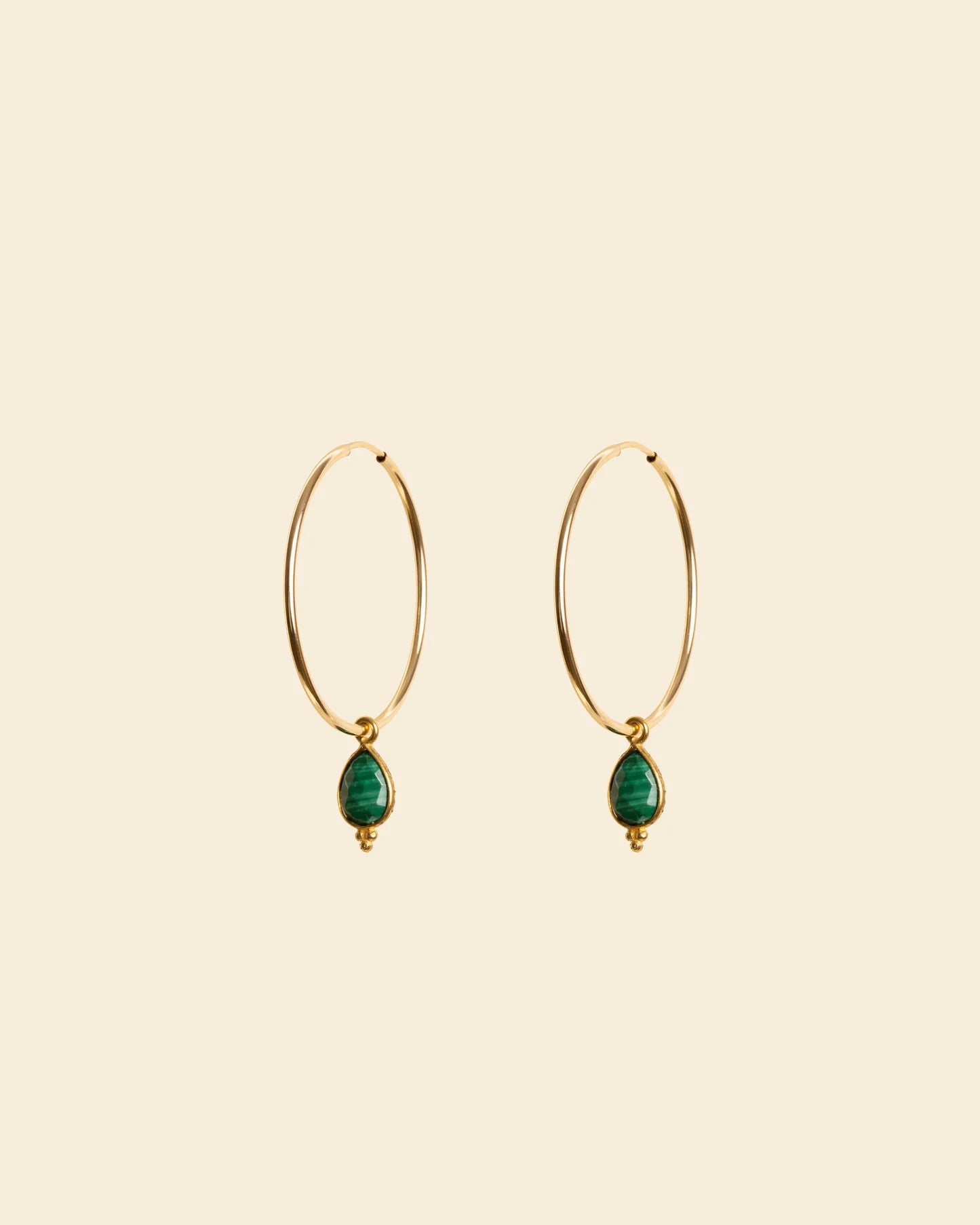 Laissez-vous envoûter par l'intensité des créoles VIVA. De larges anneaux dorés illuminent votre visage, ornés de gouttes facettées de malachite, une pierre naturelle au vert profond et captivant. Ces créoles, à la fois lumineuses et audacieuses, incarnent l'esprit ensoleillé de MINAË. VIVA, un bijou pour les femmes qui célèbrent leur beauté unique.
